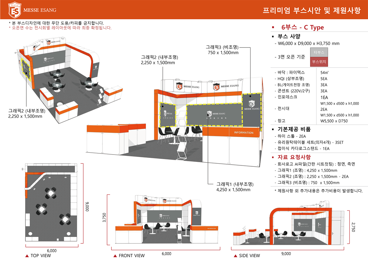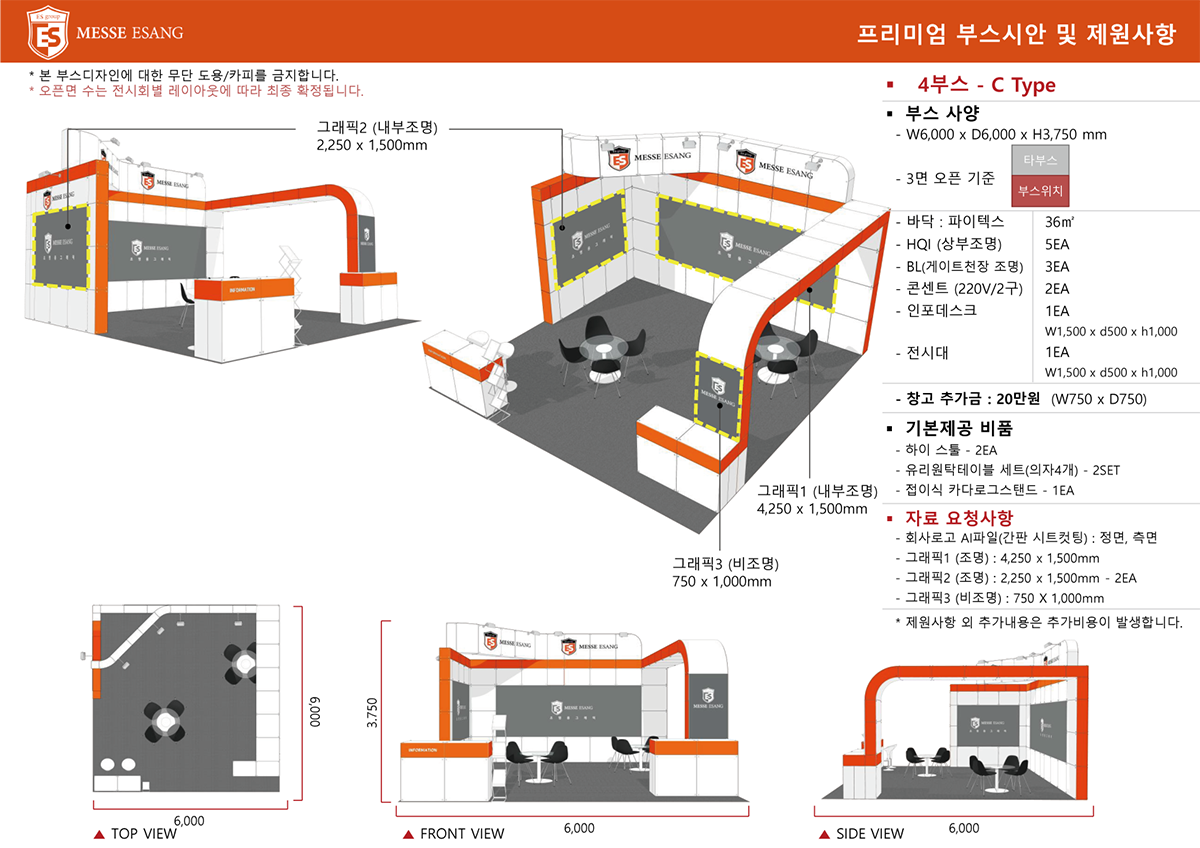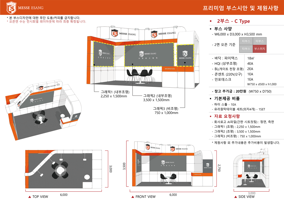 ![]() | C타입 (Company부스) | 1,250,000원 | 3m * 2m | 3m *2m * 2.4h | 업체당 : 데스크 1(1,000 x 600 x 750h), 접의자 1, 전기 1, 콘센트 1 부스당 : 암스팟 2 |